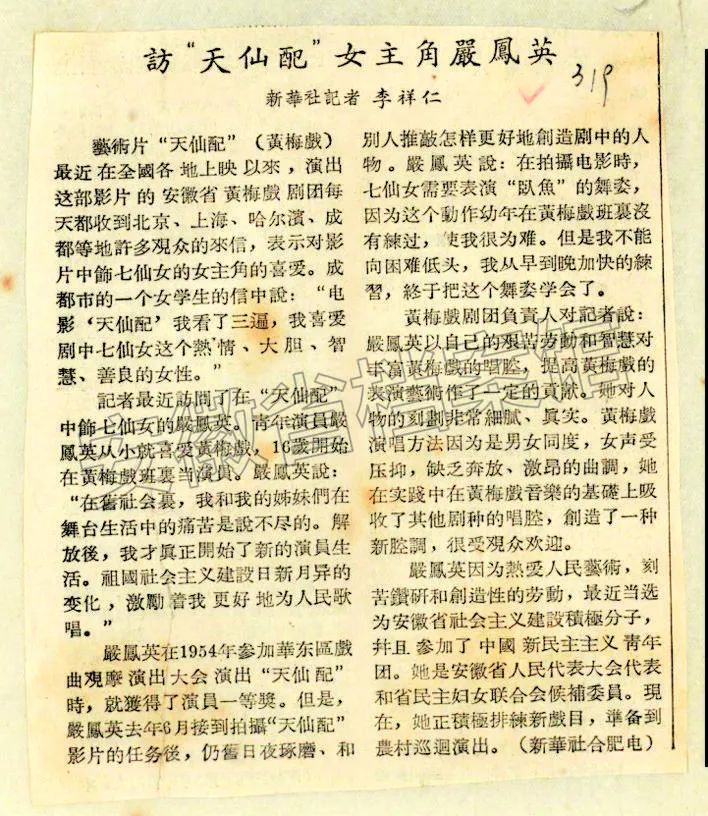 也就在1956年,全国首部黄梅戏电影《天仙配》在大银幕上惊艳亮相,这也是安徽出品的第一部黄梅戏电影,影片一经上映便如潮好评,享誉国内外。主演严凤英与王少舫更是大放异彩,成为国内外家喻户晓的明星人物。当时,新华社合肥分社对严凤英进行了专访,这段珍贵的采访资料,如今被收录于馆藏档案《访“天仙配”女主角严凤英》中。