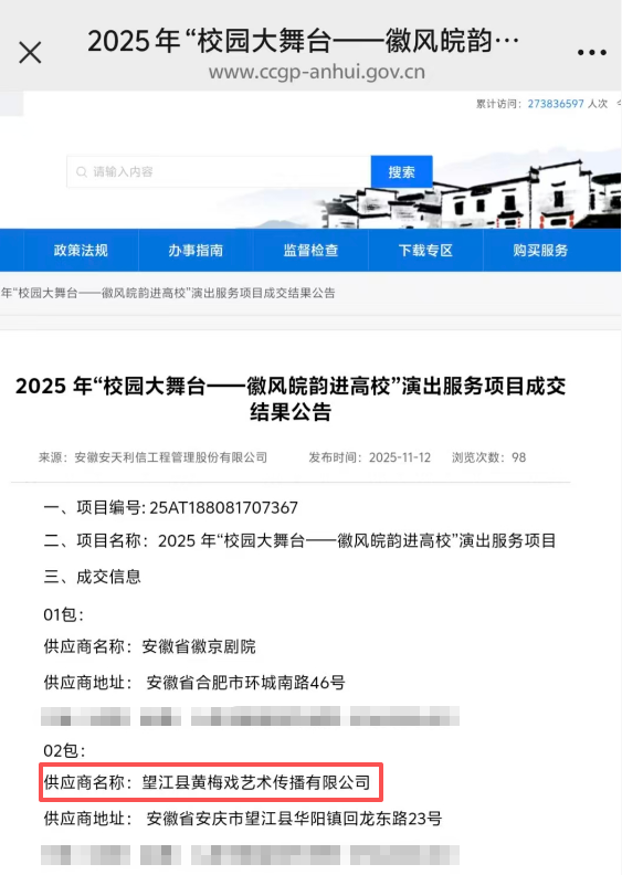 近日,由中共安徽省委宣传部、省文化和旅游厅、省教育厅联合主办的2025年校园大舞台“徽风皖韵进高校”活动顺利完成招投标工作。据悉,本次招标共分三档进行,望江县黄梅戏剧团成功中标第一档,将承担包括12所省内高校在内的共计12场演出任务。这是该团连续三年中标并承担这项演出活动。