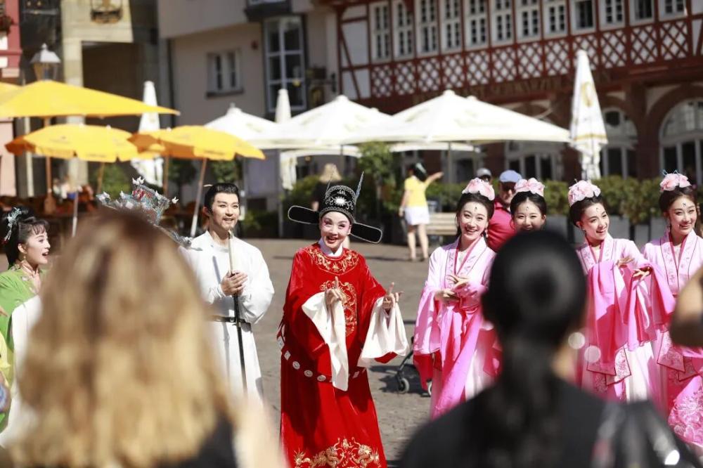 德国法兰克福“快闪”现场。图中白衣男子由左至右依次为王泽熙饰李白、韩再芬饰冯素珍、再芬剧院青年演员表演天女散花。