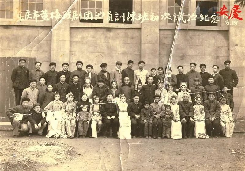 另一张老照片拍摄于1957年3月19日,是安庆市黄梅戏剧团演员训练班初次试演纪念,照片汇聚了当时的市文化系统、黄梅戏剧团的负责人、老艺人、艺术骨干,以及新进学员共五十余人合影。