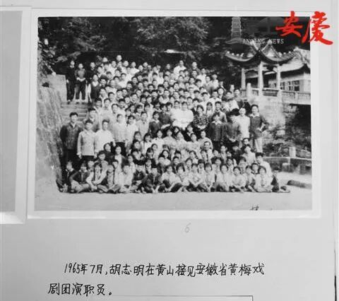 市档案馆黄梅戏照片档案中保存着两张珍贵的合影,其中一张照片备注为:1965年,胡志明、董必武在黄山接见安徽省黄梅戏剧团演员合影。这张大合影人员众多,背景是在黄山风景区一家宾馆前,虽然照片略显斑驳不清,但每个人脸上都洋溢着灿烂的笑容。前两排是当地的小学生席地而坐,严凤英等黄梅戏演员在第三排,胡志明与董必武在大家的簇拥下坐在第四排中间位置,两人亲切和蔼、笑容可掬。